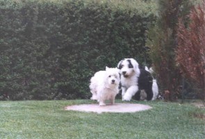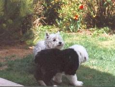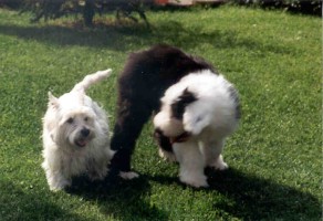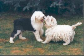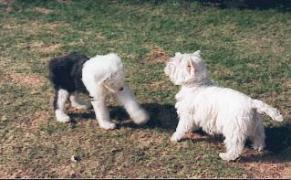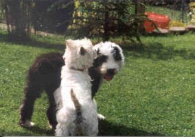 Nelly with trouble-maker Babette. When Babette joined us our westies were used to the fast growing of an Old English Sheepdog to an imposant height. With Babette they were demanded too much like all of us.