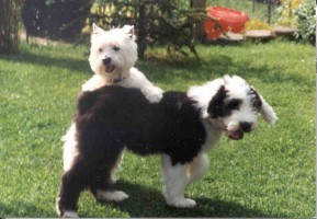 The difference between Babette and Fanny is very good shown by the following pictures. Fanny was very gentle and Leila's best friend. Also our Bobtail Maja is always very careful with our Westies.